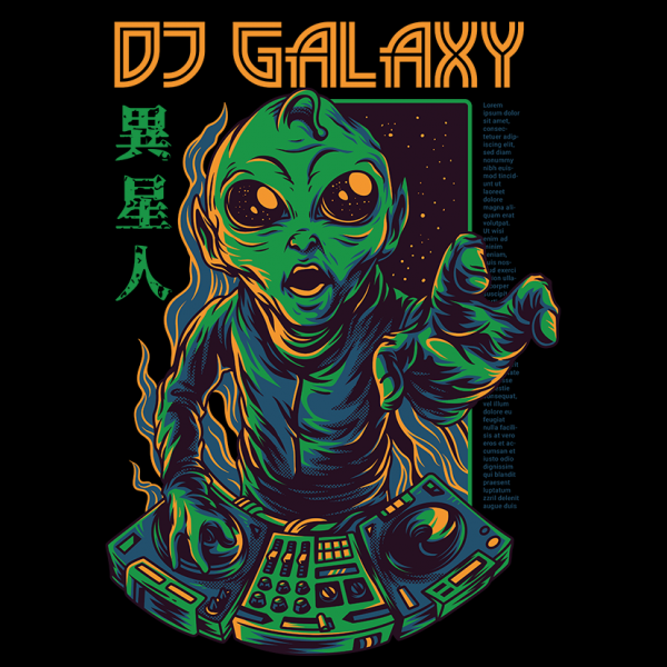 Dj Alien Galaxy T-Shirt Design its a Character Design that was made in adobe illustrator. Based on vector file , easy to resize and edit. File features AI, EPS, PDF and PNG all in zip, CMYK color mode. Can be used for digital printing and screen printing. its a Character Design that was made in adobe illustrator. Based on vector file , easy to resize and edit. File features AI, EPS, PDF and PNG all in zip, CMYK color mode. Can be used for digital printing and screen printing.