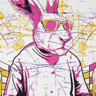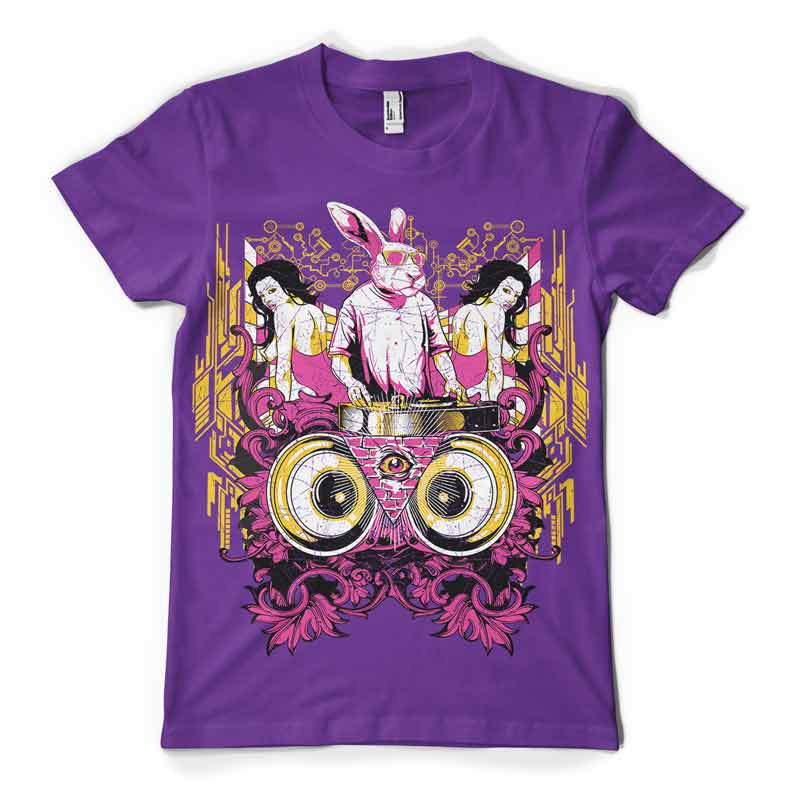 DJ t-shirt design features a detailed screen print of dj rabbit now available for Adobe Illustrator, Adobe Photoshop and Corel Draw and can be used for digital printing and screenprinting .