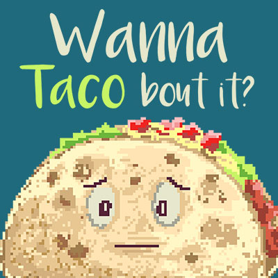 Do you wanna taco Bout It. Inspired from the retro video game pixel art mixed with funny quotes and taco cartoon illustration. Made with pixel art illustration.