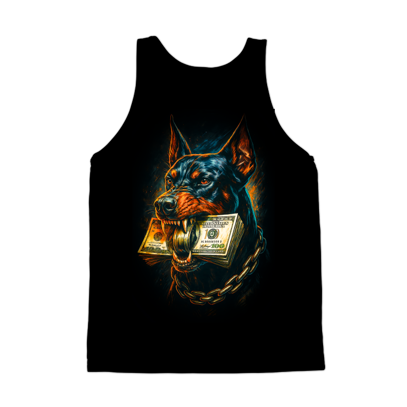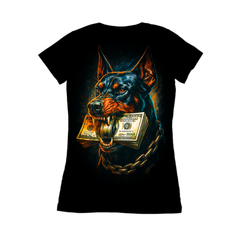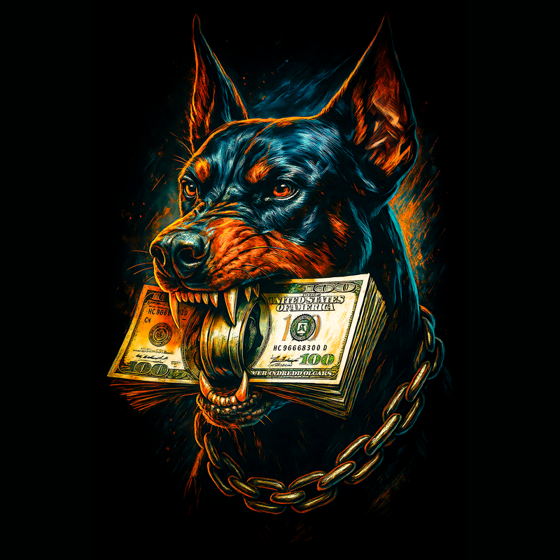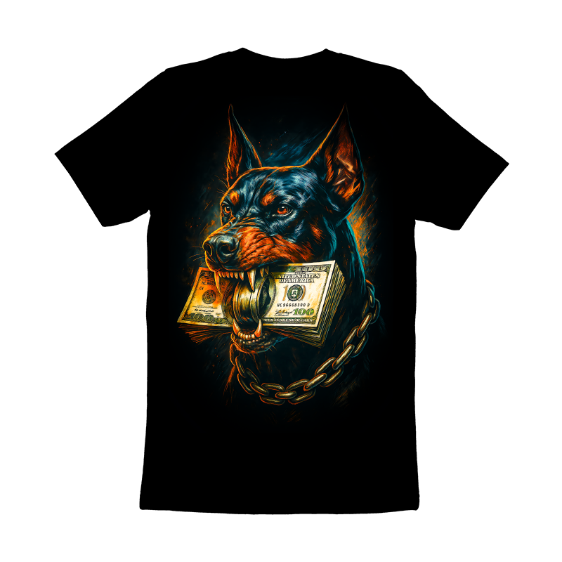 This striking design features a Doberman Pinscher, rendered in a vibrant, almost neon color palette against a stark black background. The dog's intense gaze and sharp features are accentuated by the bold use of blues, oranges, and yellows, creating a powerful and somewhat menacing presence. A thick gold chain adorns its neck, while the dog fiercely grips a wad of hundred-dollar bills in its mouth, adding a layer of edgy opulence to the composition. The overall style leans towards a modern, urban aesthetic, reminiscent of street art or contemporary tattoo designs. The contrast between the animal's natural ferocity and the symbols of wealth creates a compelling visual narrative, hinting at themes of power, protection, and the pursuit of riches. Designers could use this image for various purposes, including apparel, posters, or digital marketing materials. It would be especially effective for brands targeting a younger, more urban audience or those in the finance or security industries. The design's bold style and striking imagery make it suitable for creating eye-catching graphics.