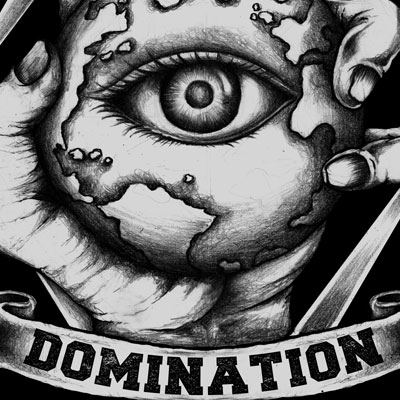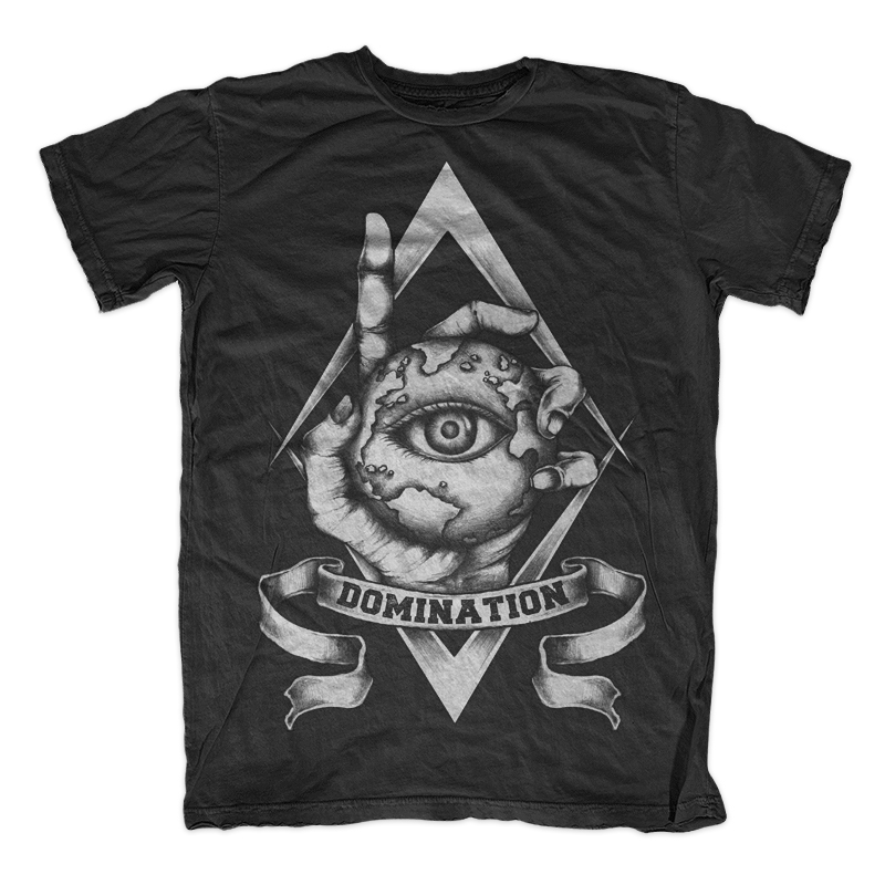 Illustration of hand holding earth for domination with eye and triangle. Ready to print on t-shirt.