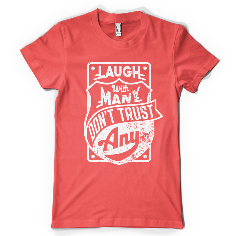 "Don't trust any" T-shirt design featuring typography style quote, with distressed details. The files available are suitable for Adobe Illustrator, Adobe Photoshop and Corel Draw and can be used for digital printing and screenprinting.