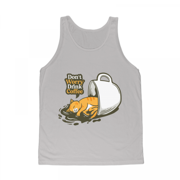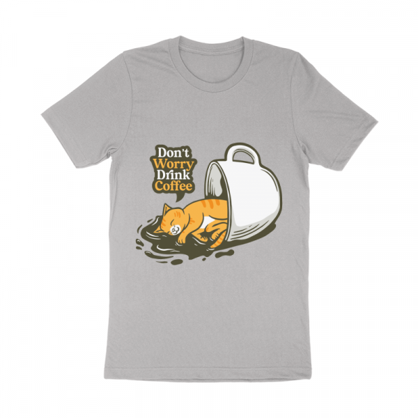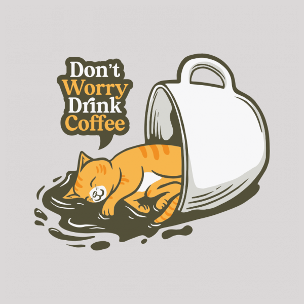 Don't Worry Drink Coffee is a vintage handdrawn illustration that is suitable for apparel or merchandise about cat, animal, pet, kitten, kitty, coffee, drink, caffeine, funny, barista, cats, cute, meme, quote, beverage, espresso, cappuccino, latte.