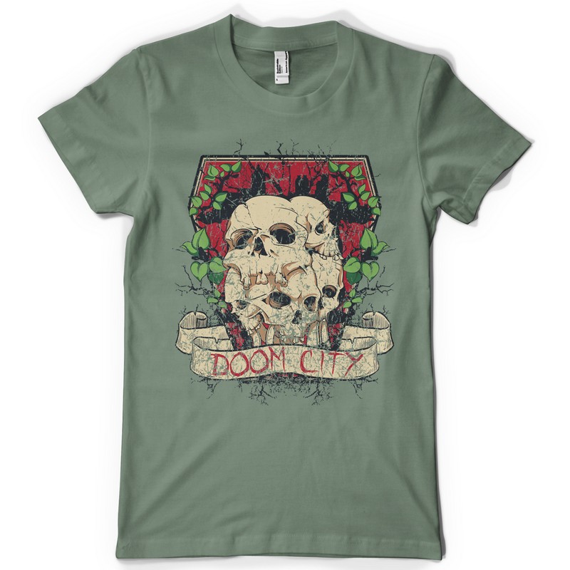 Doom city printed t-shirt features a detailed screen print of creepy graveyard and crowded skulls is now available in EPS format file and can be used for digital printing and screenprinting . Ready to print or use in anything you want.