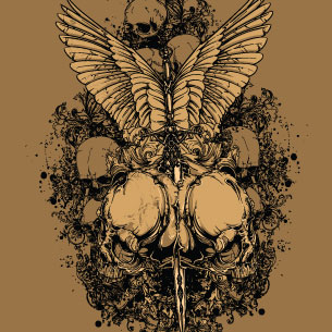 Double edged digital design template in vector format, featuring detailed multiple skulls and flourish details now available for Adobe Illustrator, Adobe Photoshop and Corel Draw and can be used for digital printing and screenprinting .