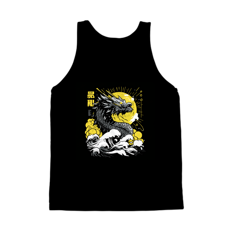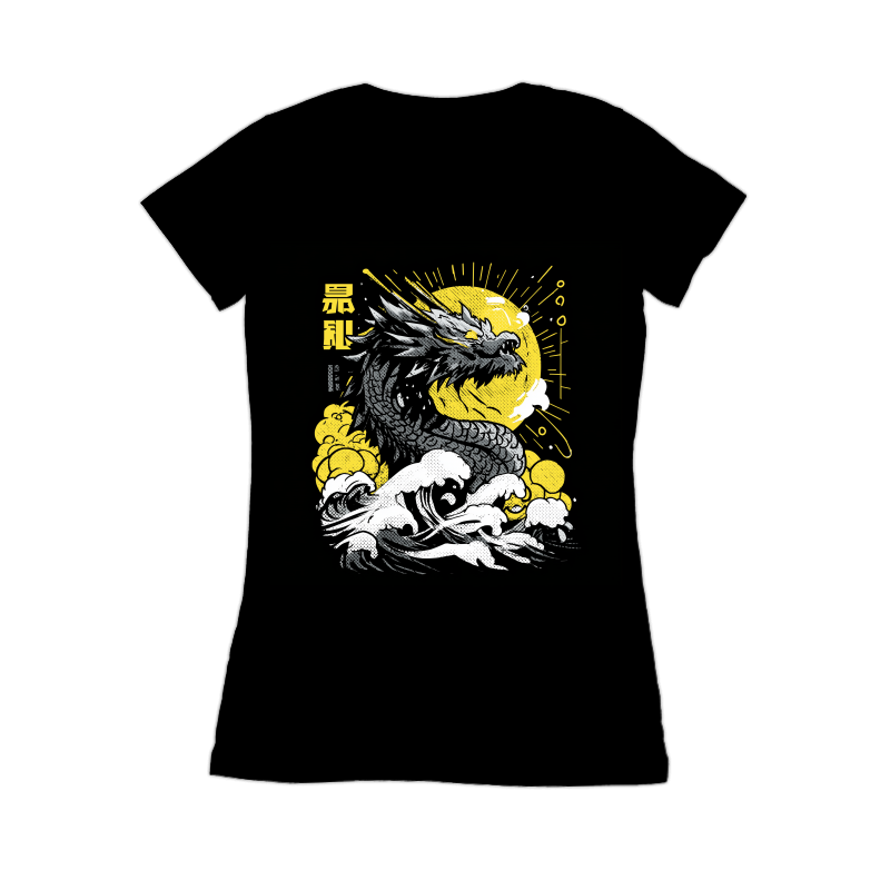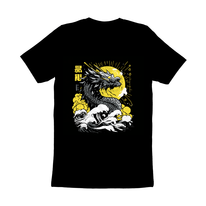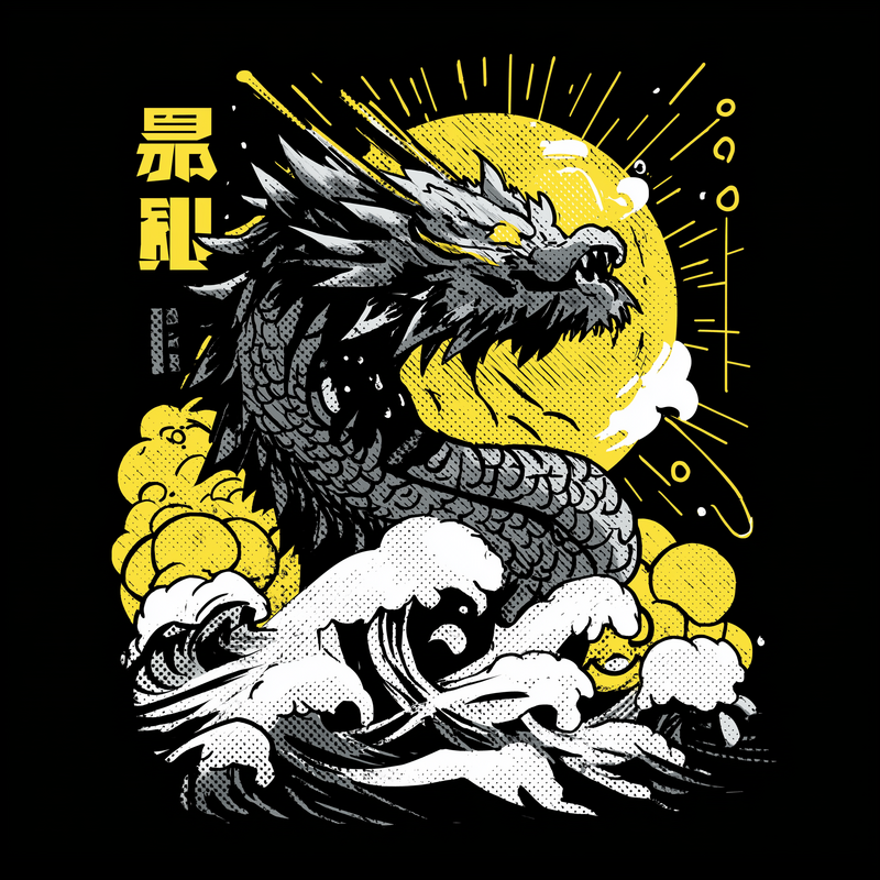 This striking design features a formidable dragon emerging from turbulent waves, set against a backdrop of a stylized sun. The dragon is rendered in shades of gray, with intricate detailing on its scales and features. The waves are depicted with a halftone effect, adding a vintage touch to the overall composition. The sun, rendered in yellow, radiates energy and light, contrasting with the darker tones of the dragon and waves. Japanese characters are placed vertically on the left side of the image, adding an element of mystique and cultural context. The design is visually dynamic, capturing the power and majesty of the dragon in a unique and artistic style.