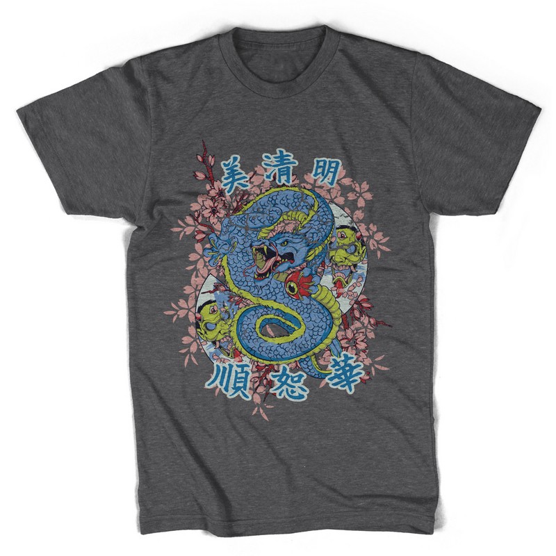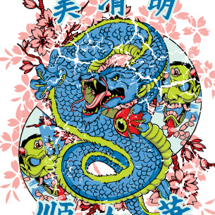 Dragon's gift design template in vector format, featuring detailed dragon and cherry flowers now available for Adobe Illustrator, Adobe Photoshop and Corel Draw and can be used for digital printing and screenprinting .