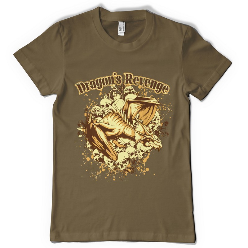 Dragon's revenge digital design template in vector format, featuring detailed dragon flying over a crowd of skulls now available for Adobe Illustrator, Adobe Photoshop and Corel Draw and can be used for digital printing and screenprinting .