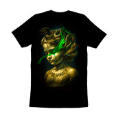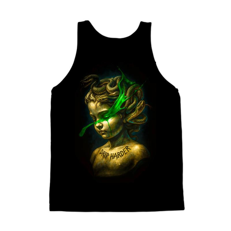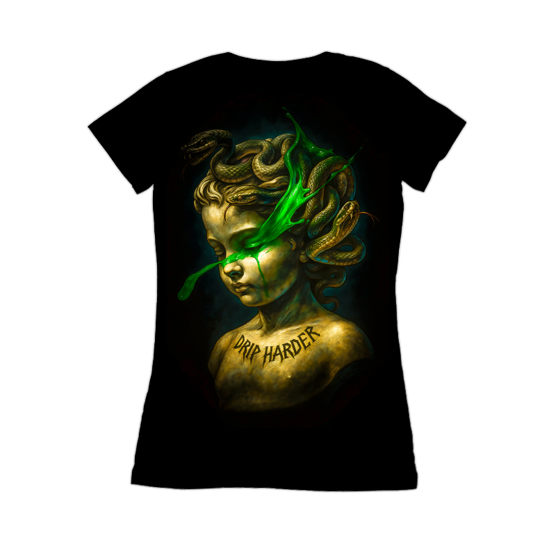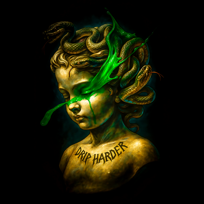 This design presents a modern take on the classic Medusa, blending ancient mythology with contemporary aesthetics. The iconic snake-haired Gorgon is depicted as a golden statue, with a vibrant green liquid, possibly slime or paint, dramatically cascading from her eyes. The phrase "DRIP HARDER" is emblazoned across her chest in a bold, stylized font, adding an edgy, urban twist. The statue-like texture of Medusa's skin contrasts sharply with the smooth, glossy texture of the green liquid, creating a visually striking effect. The overall composition balances classical art with modern street style, making it a versatile design for various applications. Designers could leverage this image for streetwear apparel, edgy posters, or album art. The combination of classical mythology and modern slang makes it appealing to a younger audience. It could also be used in promotional material for music events or urban art exhibitions. The striking visual would work well on social media campaigns.