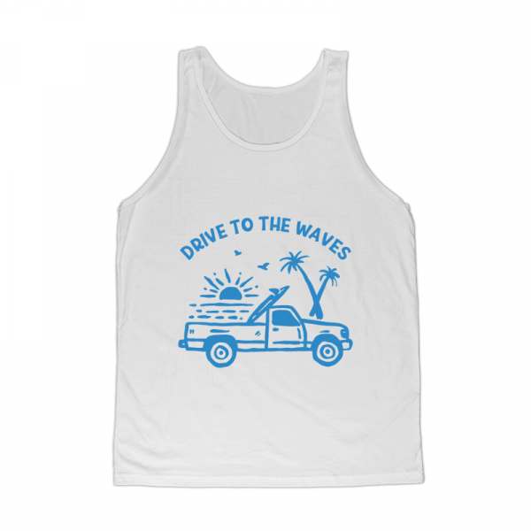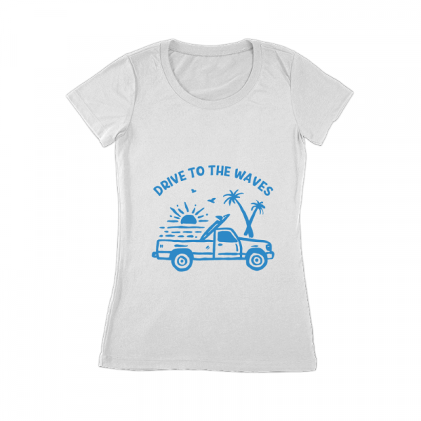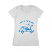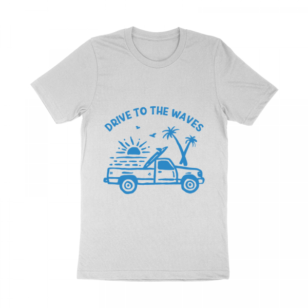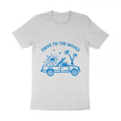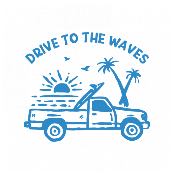 Drive to the Waves is a monoline illustration that is suitable for apparel or merchandise about summer, vacation, holiday, travel, beach, surfing, surfboard, tropical, sea, adventure, trip, california, vehicle, hawaii, sunset.