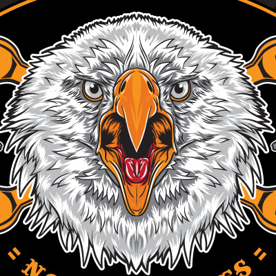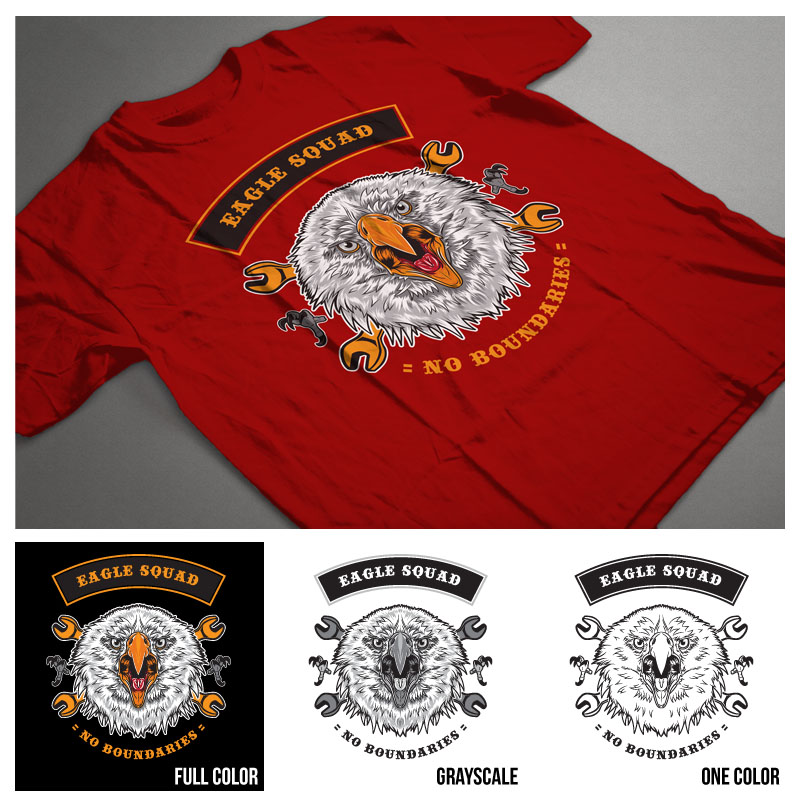 Eagle Squad T shirt Illustration "Biker Patches Animals Series" An illustration of an angry Eagle head with, motorcycle chain, and some ornaments. Suitable for your biker community, clothing line store, or event. Easy to replace the text and colors. ZIP Feautures 3 Folder Full Colors version, Gray Colors Version and 1 Color version Each folder contain 1 EPS 10 1 Ai 1 PSD Size 16'x24' CMYK Color mode Layered Editable text