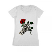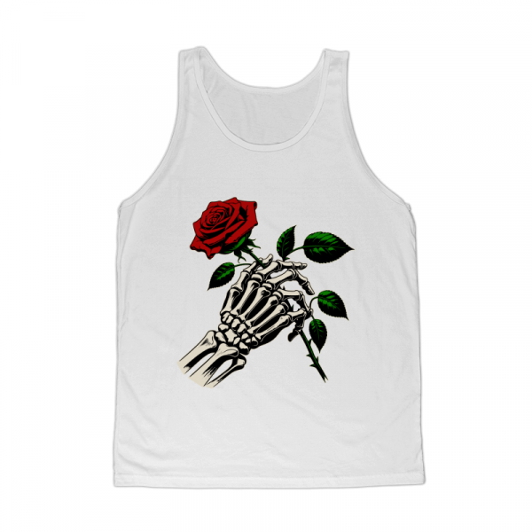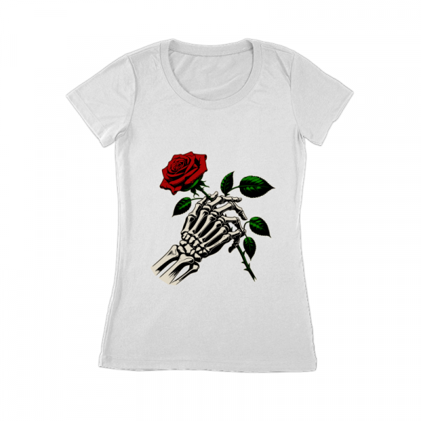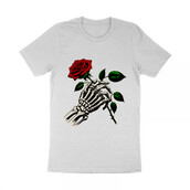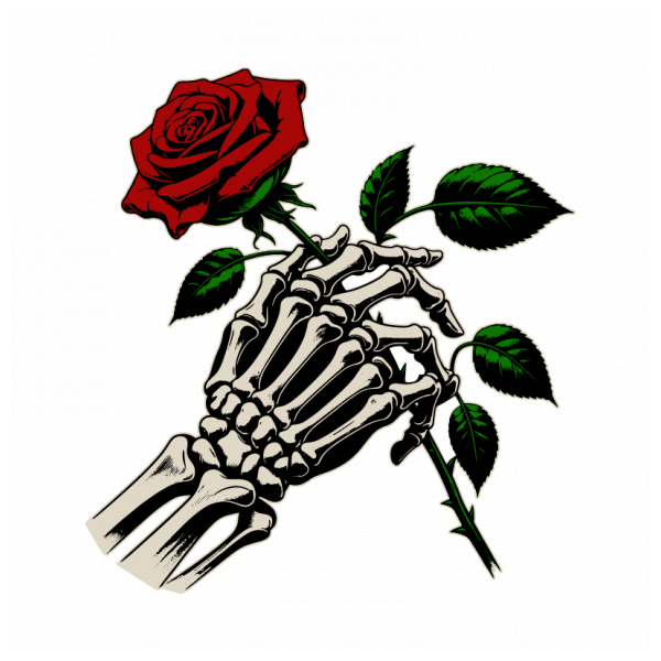 This striking and evocative illustration features a skeletal hand delicately holding a vibrant red rose. The detailed bones of the hand are rendered with precision, showcasing the intricacies of the skeletal structure. The stark white of the bones contrasts sharply with the rich red petals of the rose, creating a powerful visual impact. The rose, with its lush green leaves and thorns, symbolizes life, beauty, and love, while the skeletal hand represents death, mortality, and the passage of time. This juxtaposition of life and death, beauty and decay, creates a compelling and thought-provoking image. The dark outlines and shading add depth and dimension to the illustration, enhancing its dramatic effect. Perfect for use in tattoo designs, gothic fashion, or any artistic project that explores themes of life, death, and the delicate balance between the two. The high level of detail and the striking contrast make this illustration a captivating piece that is sure to draw attention and provoke contemplation.