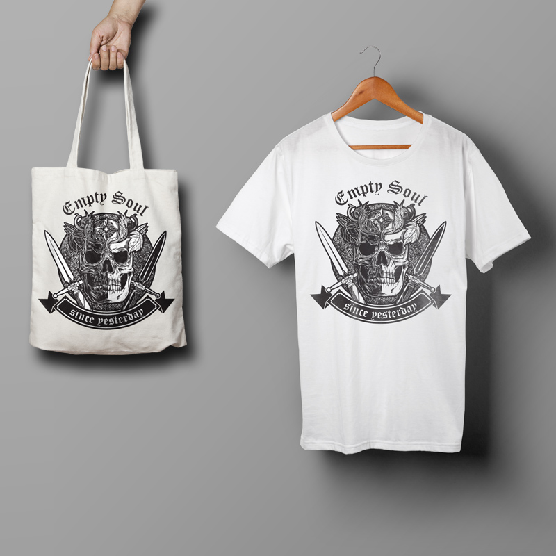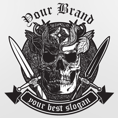 An illustration of a skull with black and white color, leaf crown and knifes.