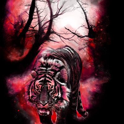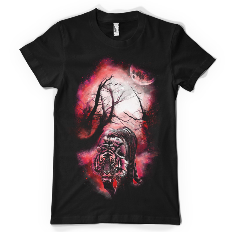 "Enchanted Trails" is an illustration of a tiger walking towards you with a unique enchanted background of neon pink, white and hot red colors combined giving a unique burst of colors into the shirt. File contains a PSD file with 17x24 in size.