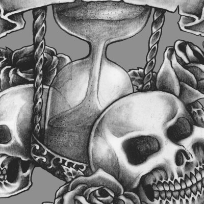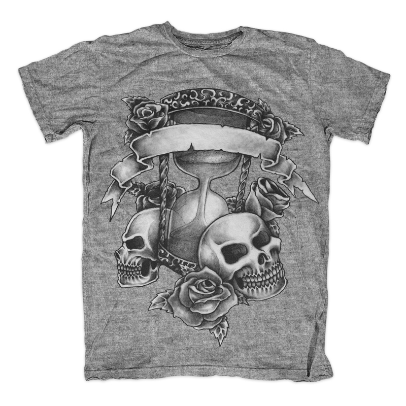 Illustration of time and skull with banner and scroll, made with hand drawing looking and tatto style design. Ready to print on t-shirt.