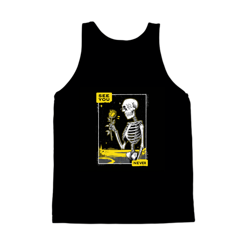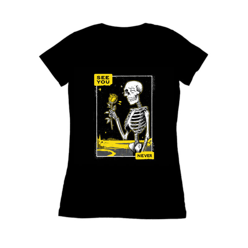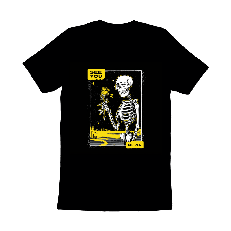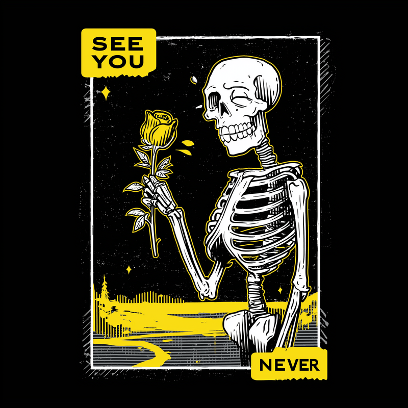 This striking design features a stylized skeleton holding a rose, rendered in a bold black and white with yellow accents. The skeleton, depicted in a three-quarter view, gazes wistfully at the flower, creating a melancholic yet captivating scene. The background includes a stylized landscape with a river, adding depth and context to the composition. The words "SEE YOU" and "NEVER" are placed at the top and bottom, respectively, framing the central image and enhancing the design's overall theme of farewell and mortality. The design incorporates a slightly distressed texture, giving it a vintage or grunge aesthetic. The use of clean lines and contrasting colors makes it visually appealing and suitable for various applications.