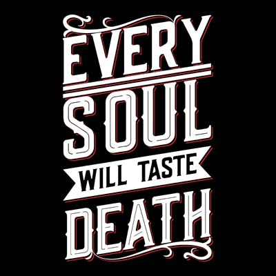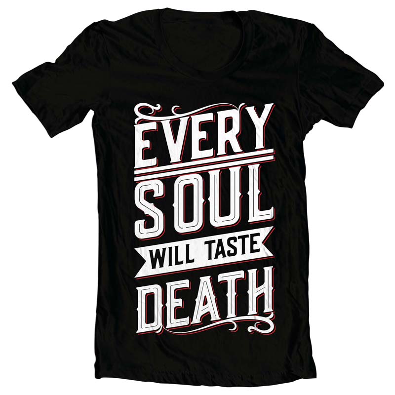 "Every Soul will Taste Death" T-shirt design featuring typography style quote, with distressed details. The files available are suitable for Adobe Illustrator and can be used for digital printing and screenprinting.