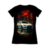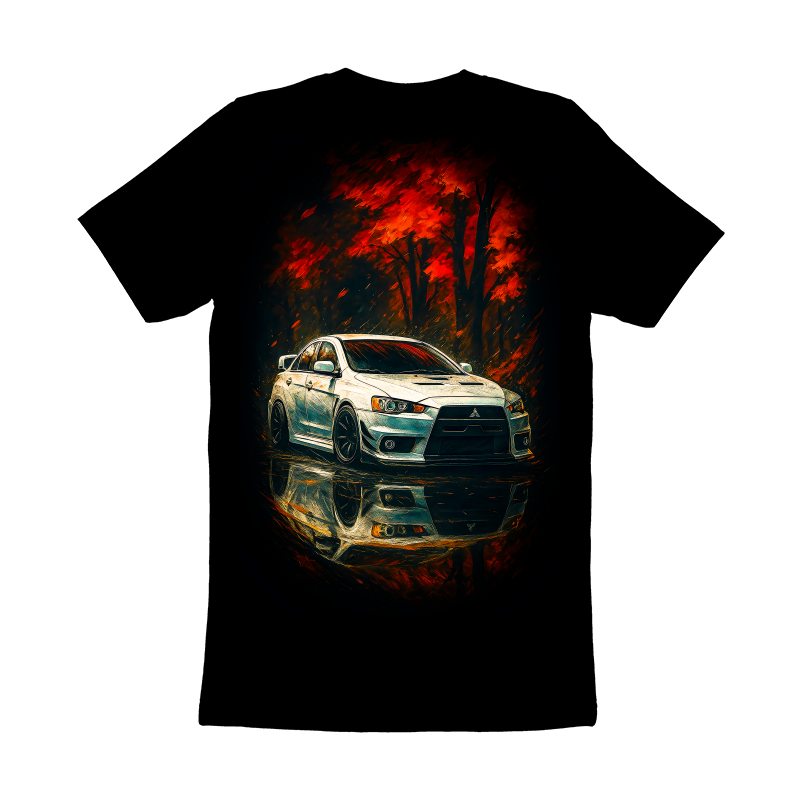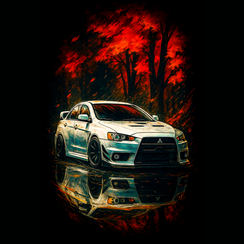 This artwork captures a Mitsubishi Lancer Evolution in a dynamic interplay of fiery aesthetics. The car, rendered in a blend of cool silvers and blues, stands out against a backdrop of fiery reds and oranges, creating a striking visual contrast. The reflection beneath the car adds depth, mirroring the vibrant chaos above. The style leans towards a modern, painterly effect, reminiscent of digital brush strokes, giving it an energetic and contemporary feel. The composition is dramatic, highlighting the car's sleek lines and aggressive stance, while the background suggests a blurred, abstract landscape, intensifying the focus on the vehicle. The overall effect is bold and intense, appealing to automotive enthusiasts and fans of dynamic digital art. Designers could use this image for automotive-themed posters, website backgrounds, or social media content. It would be perfect for promoting car-related products or events. The fiery theme could also be adapted for gaming or racing-related designs, appealing to a younger, tech-savvy audience. Its dynamic style would make it stand out in advertising campaigns.