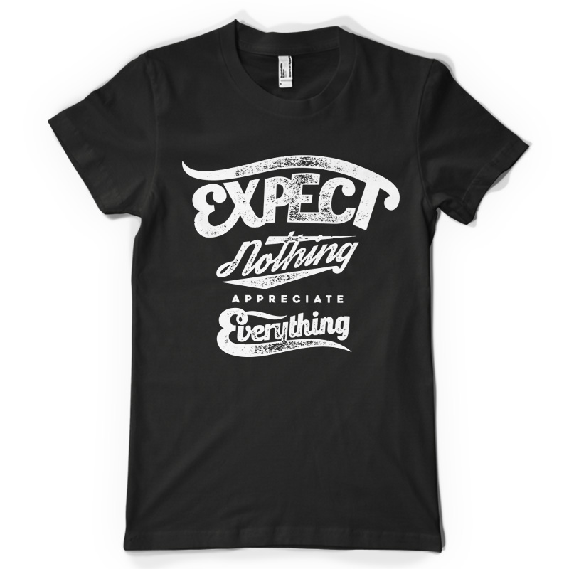 "Expect Nothing" T-shirt design featuring typography style quote, with distressed details. The files available are suitable for Adobe Illustrator, Adobe Photoshop and Corel Draw and can be used for digital printing and screenprinting.
