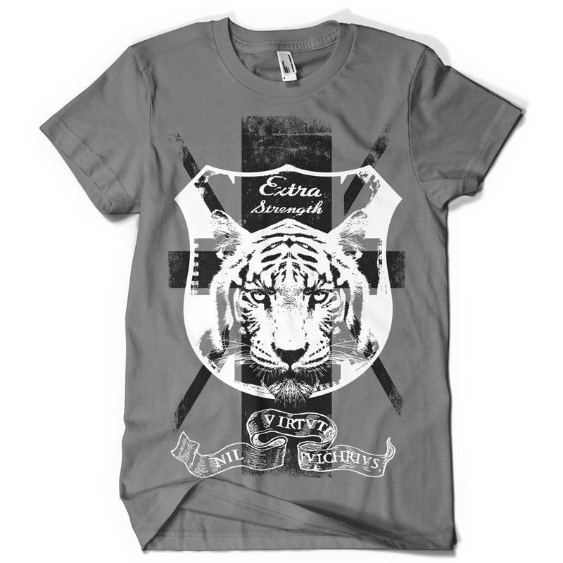 Extra strength graphic design template in vector format, featuring detailed tiger shield now available for Adobe Illustrator, Adobe Photoshop and Corel Draw and can be used for digital printing and screenprinting .