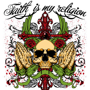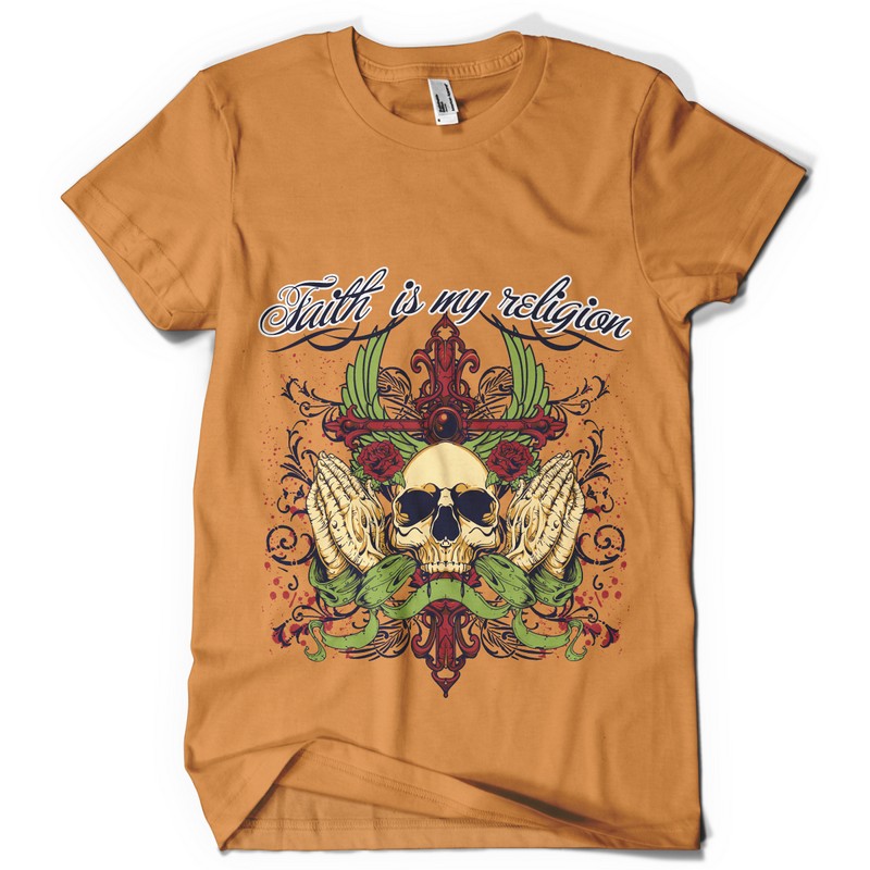 Faith is my religion graphic template in vector format, featuring detailed skull and pray hands now available for Adobe Illustrator, Adobe Photoshop and Corel Draw and can be used for digital printing and screenprinting .