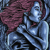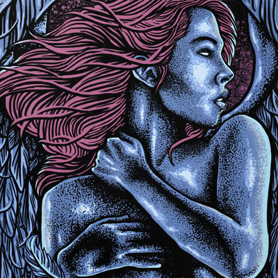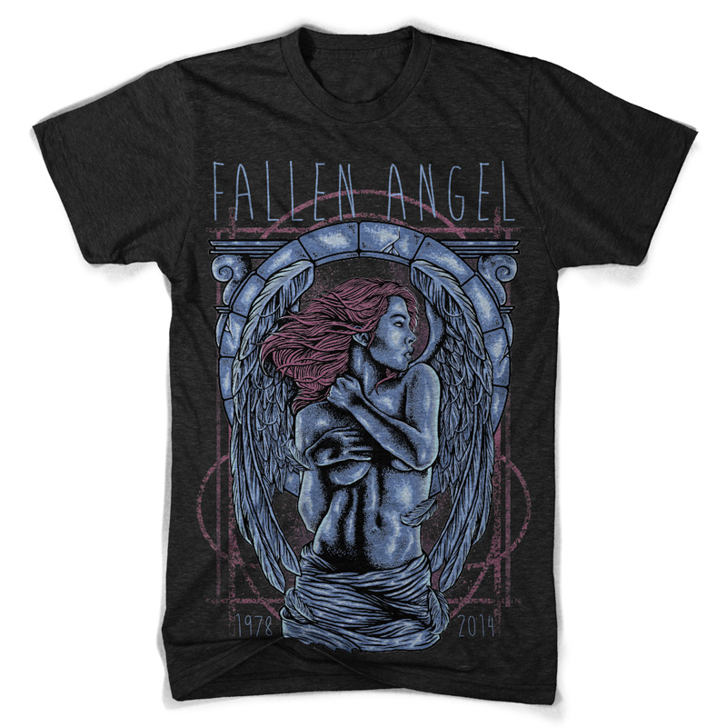 Fallen Angel t-shirt design. Digital illustration featuring detailed sexy female with wings, sorrounded by a stone frame. The source file is available in psd format and can be opened with Photoshop program.