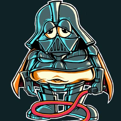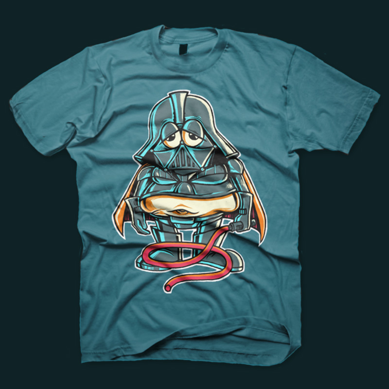 ''fatvader'' is unique Illustration of a boy with darthvader mask in star wars movie, but i make him a little parody. with blank for background and use pastel colors pallete...Made with hand vector looking and dark style. Ready to print on t-shirt.