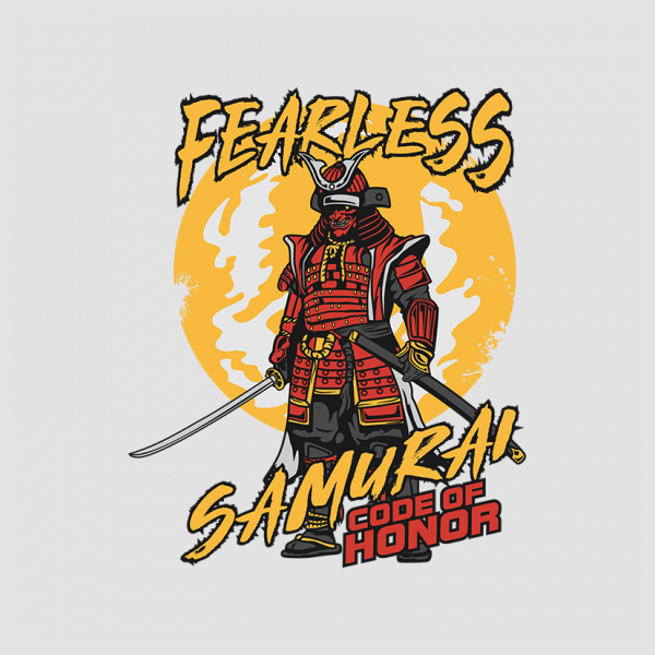vector illustration of FEARLESS SAMURAI CARTOON, this image is very cute for t-shirts and posters, this design is available in the form of files, CDR, AI, transparent backround PNG, JPEG, SVG, EPS, mookup not included