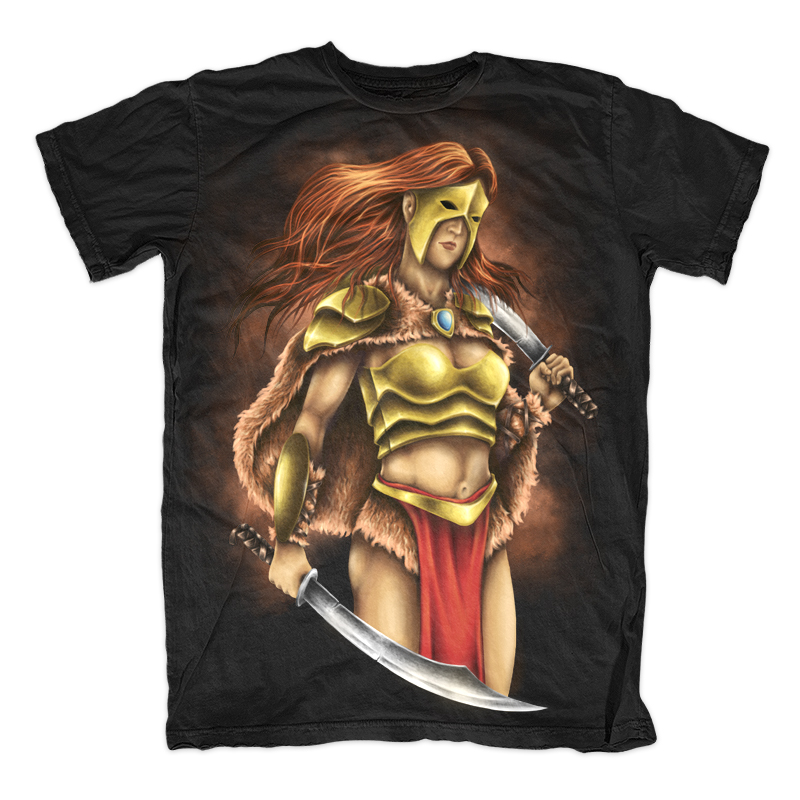 Illustration of long hair female warrior with mask, sword, armor. Ready to print on t-shirt.