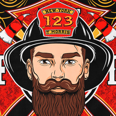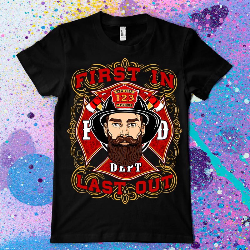 First in Last out t-shirt design features a shield firefighter design detailed screen print now available for Adobe Illustrator, Adobe Photoshop and can be used for digital printing and screenprinting.