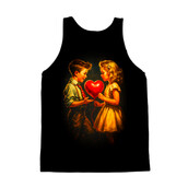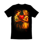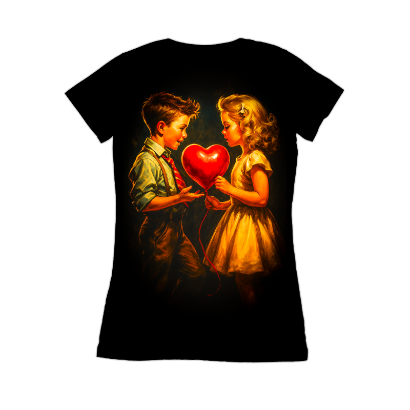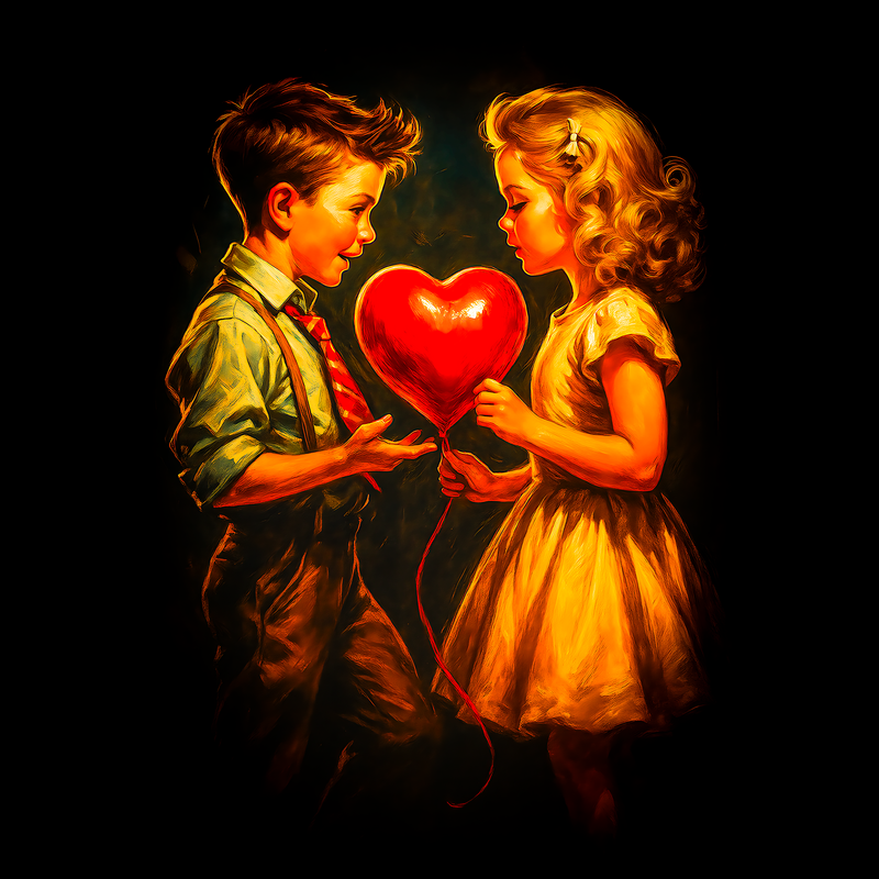 This artwork captures the tender innocence of young love. A boy and a girl, rendered in a style reminiscent of classic storybook illustrations, gaze at each other with palpable affection. The warm, golden light bathes the scene, highlighting the rosy cheeks and bright eyes of the children. The artwork evokes a sense of nostalgia and purity, making it ideal for projects that celebrate love, childhood, and cherished memories. The overall aesthetic is reminiscent of vintage illustrations, with a modern touch in the color palette, making it versatile for both traditional and contemporary applications. Designers could use this image for greeting cards, children's books, or even as a print for nursery decor. Its vintage charm and heartwarming subject matter make it suitable for a variety of applications, especially where a touch of nostalgia and innocence is desired. It would also be great for Valentine's Day promotions or wedding-related designs.