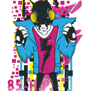 Flash bug graphic design template in vector format, featuring detailed hipster wearing a bug mask now available for Adobe Illustrator, Adobe Photoshop and Corel Draw and can be used for digital printing and screenprinting .