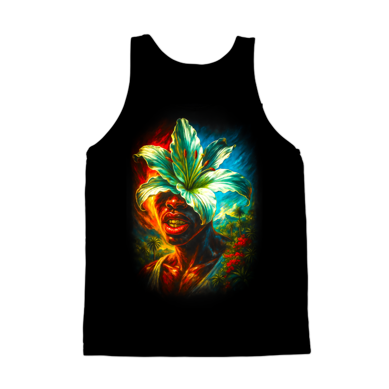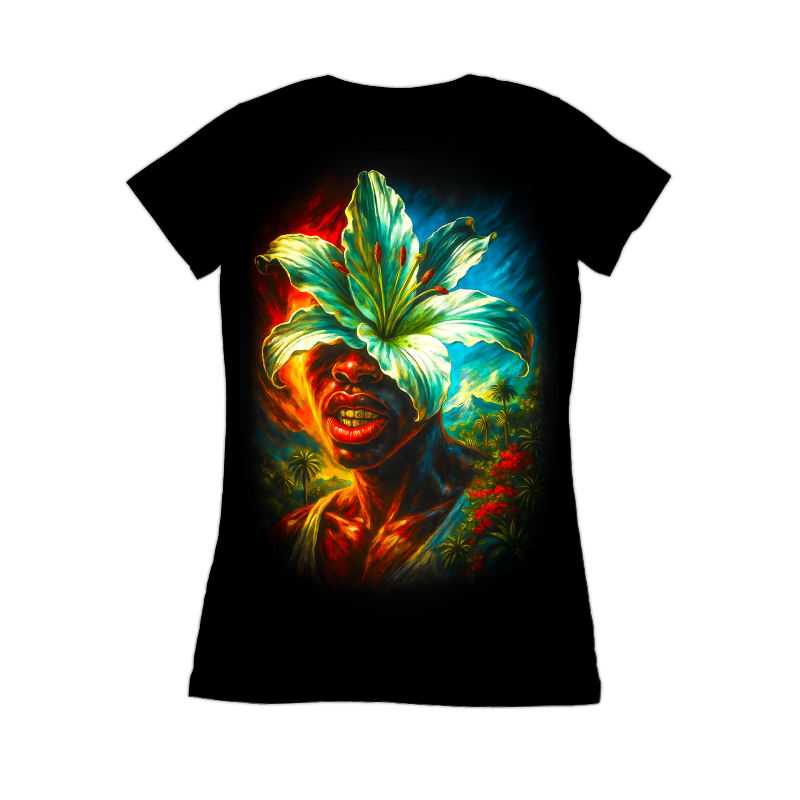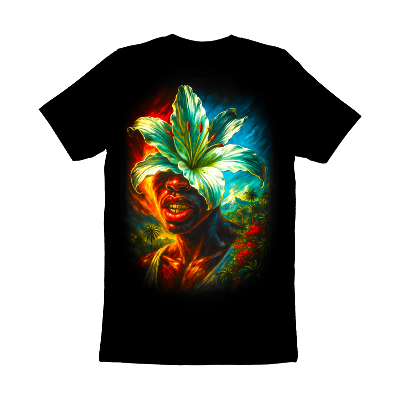 This artwork features a person adorned with a large, vibrant lily flower, obscuring the upper part of their face. The color palette is rich and intense, with fiery reds and oranges contrasting against cool blues and greens, creating a dynamic visual effect. The subject has gold teeth, adding a touch of modernity to the overall composition. The background transitions into a tropical landscape, complete with palm trees and distant mountains, suggesting a paradise-like setting. The style blends elements of realism with surrealism, making the piece captivating and unique. The use of light and shadow enhances the depth and texture, giving the artwork a three-dimensional quality. The overall effect is both striking and serene, inviting the viewer to contemplate the relationship between nature and humanity.