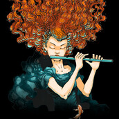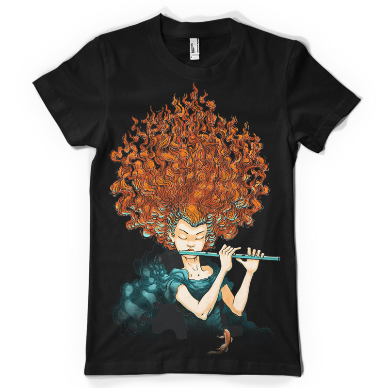 A dramatic approach of a maiden serenading a fish as they flow into streaming waters. Eye catching artwork that uses dreamlike scenes that can be worn on shirts.