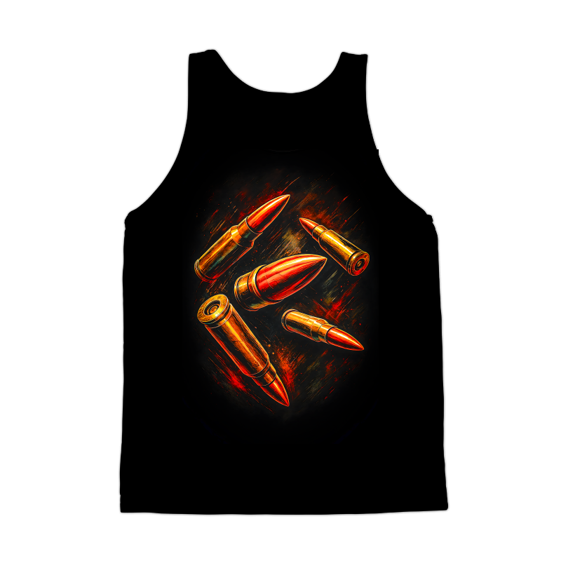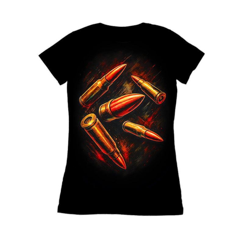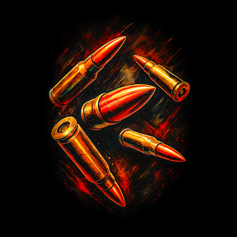 This striking design features a cluster of bullets, rendered in a dynamic and somewhat abstract style. The bullets are depicted in varying sizes and orientations, creating a sense of motion and depth. The color palette consists mainly of warm tones, with the bullets rendered in shades of gold, bronze, and red, giving them a metallic and fiery appearance. The background is dark, which accentuates the brightness and intensity of the bullets. The overall effect is one of power, danger, and precision. The design has a modern, edgy feel, making it suitable for a variety of applications.