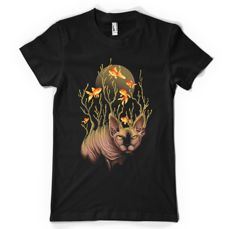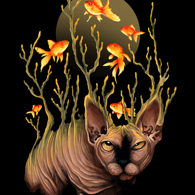 "Food For Thought" is a unique design of a Cat with Goldfishes above its head, wanting to eat them alive. This design is very eye-catching with a unique sense of humor. File contains a PSD file with 17 x 24 in size with 300 in dpi.