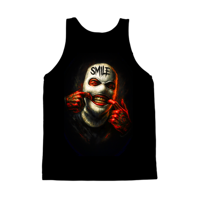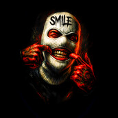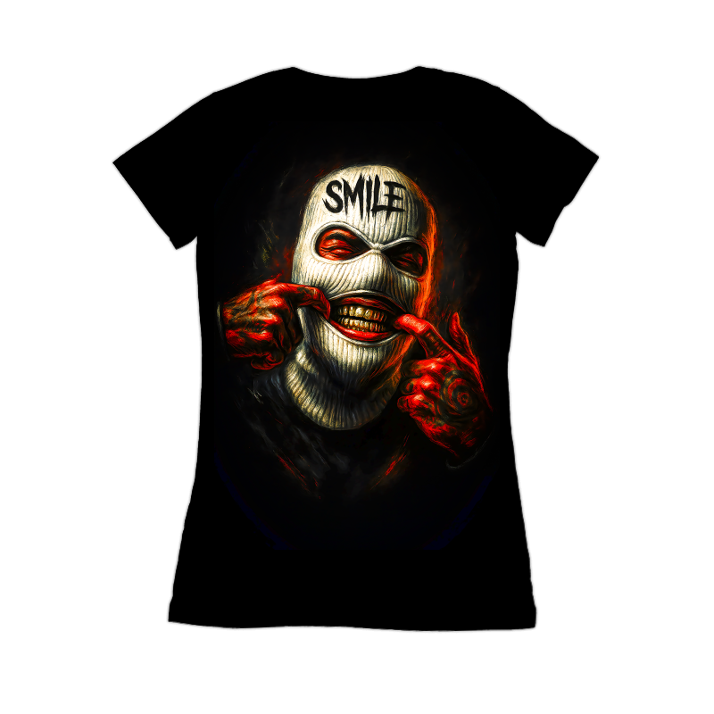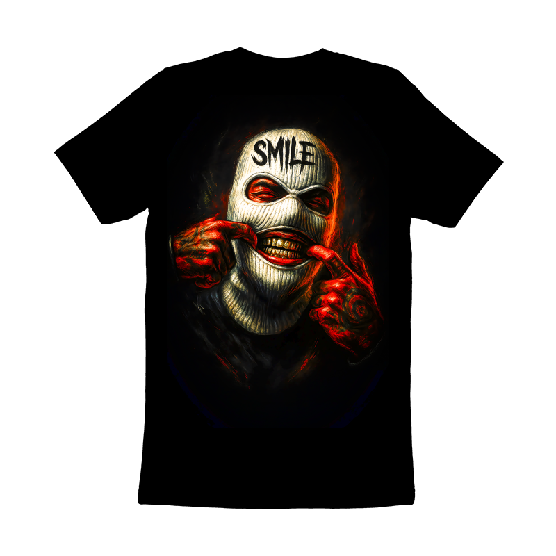 This design presents a chilling visual of a figure wearing a white ski mask, the word 'SMILE' scrawled across the forehead in jagged, unsettling letters. The eyes are shadowed and menacing, while the mouth is stretched into a grotesque smile, seemingly forced by blood-stained fingers. The overall aesthetic leans heavily into horror, with a gritty, textured style that enhances the disturbing nature of the subject. The color palette is dominated by dark tones, punctuated by stark whites and vivid reds, creating a sense of unease and dread. The design evokes elements of both urban grit and classic horror tropes, making it a striking and memorable piece. Designers could use this image for horror-themed apparel, album art for dark electronic music, or edgy promotional material for escape rooms or haunted attractions. The unsettling nature of the design makes it ideal for attracting attention and creating a memorable impact, particularly within subcultures that appreciate darker aesthetics.