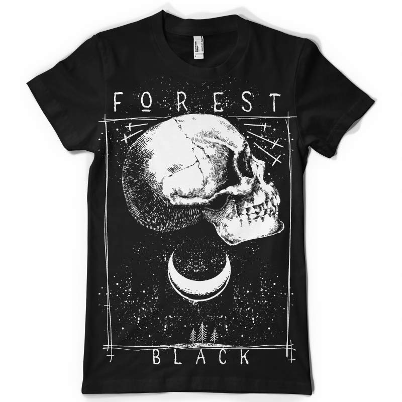Forest Black printed t-shirt features a detailed screen print of skull and universe now available for Adobe Illustrator, Adobe Photoshop and Corel Draw and can be used for digital printing and screenprinting .