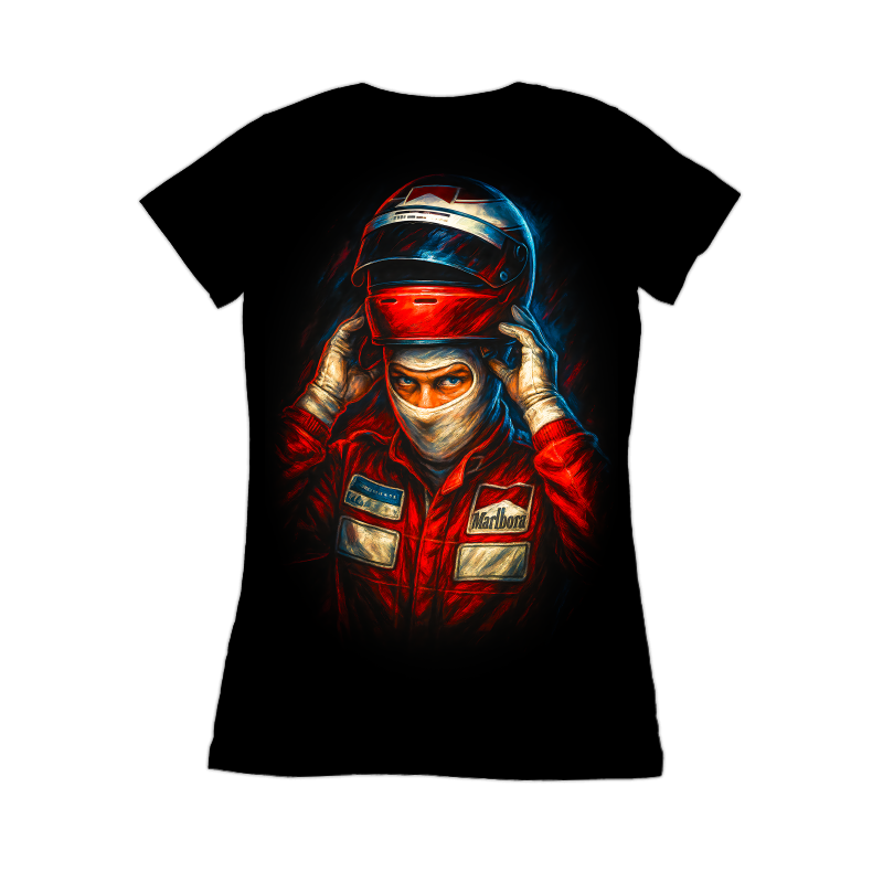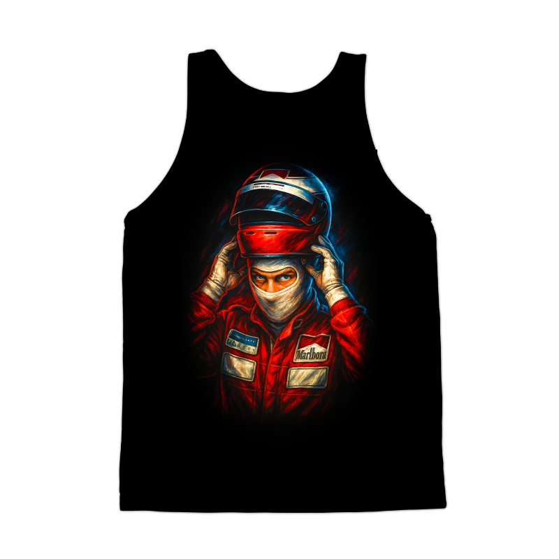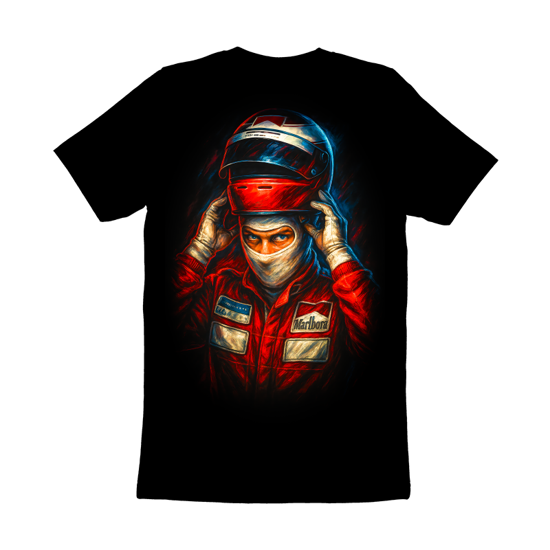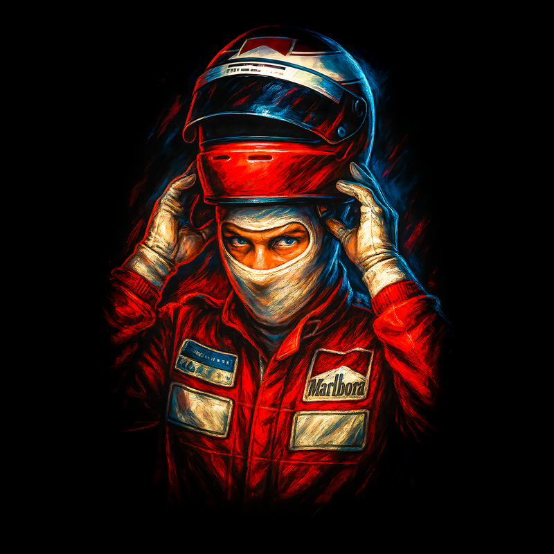 This artwork captures the intense focus of a Formula racer preparing for the track. The driver, clad in a vintage racing suit and helmet, is depicted with striking detail, emphasizing the determination in his eyes. The color palette is bold, dominated by reds and blues, creating a dynamic and energetic feel. The design blends realism with a touch of artistic flair, reminiscent of classic sports posters and comic book art. The iconic logos on the suit add a layer of authenticity and nostalgia, appealing to fans of vintage racing and motorsport history. The overall composition conveys a sense of speed, precision, and the relentless pursuit of victory that defines Formula racing. Designers could use this image for apparel, posters, or merchandise targeting motorsport enthusiasts. Its vintage aesthetic makes it suitable for retro-themed events or promotional materials. The artwork's dynamic composition and striking colors would also work well for social media campaigns or website banners, capturing attention and conveying a sense of speed and excitement.
