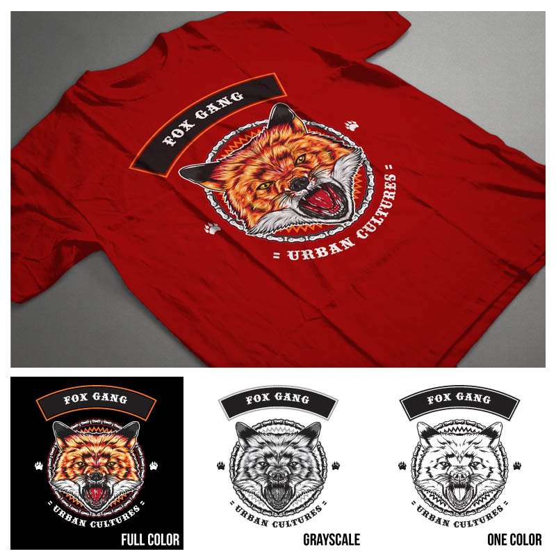 Fox Gang T shirt Illustration "Biker Patches Animals Series" An illustration of an angry Fox head with, some ornaments. Suitable for your biker community, clothing line store, or event. Easy to replace the text and colors. ZIP Feautures 3 Folder Full Colors version, Gray Colors Version and 1 Color version Each folder contain 1 EPS 10 1 Ai 1 PSD Size 16'x24' CMYK Color mode Layered Editable text