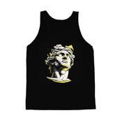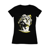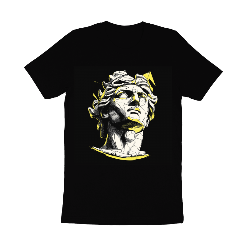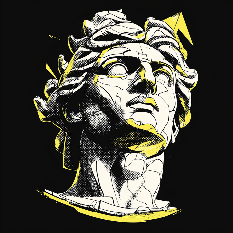 This striking vector art piece features a stylized depiction of the Apollo bust, rendered with a fractured, geometric aesthetic. The design employs a limited color palette of black, white, and yellow, creating a bold contrast. The bust is fragmented into sharp, angular shapes, giving it a contemporary and edgy feel. Halftone patterns add texture and depth, while the clean lines and precise execution showcase a modern design sensibility. The overall effect is a fusion of classical art and modern graphic design, making it a visually compelling and versatile image.