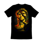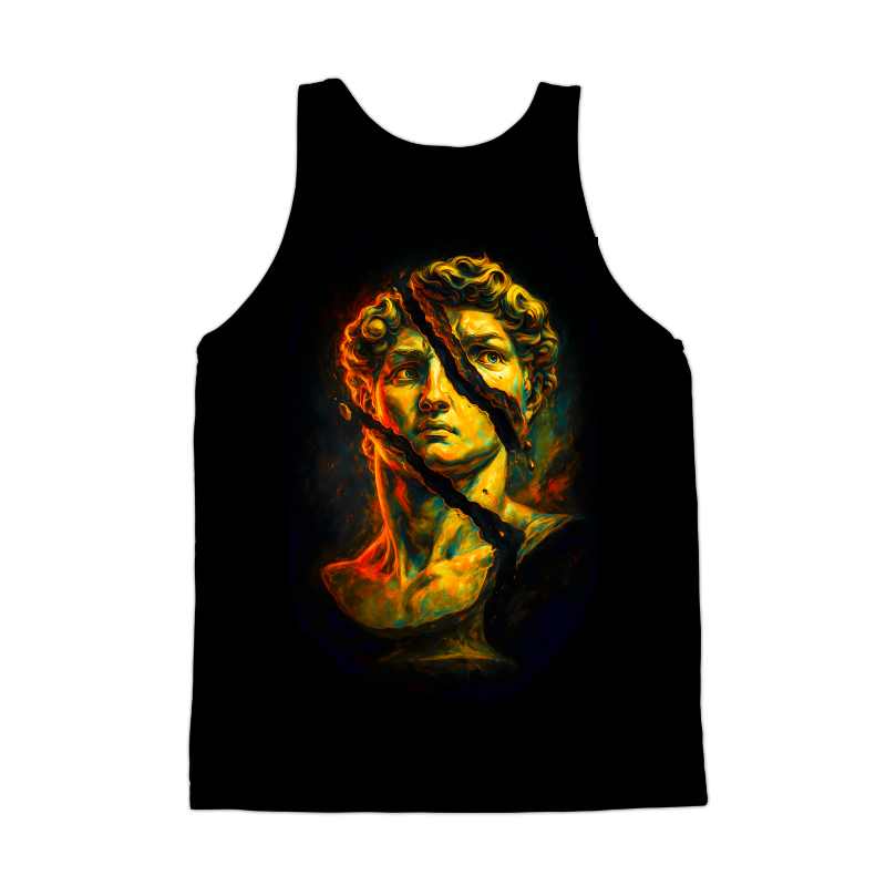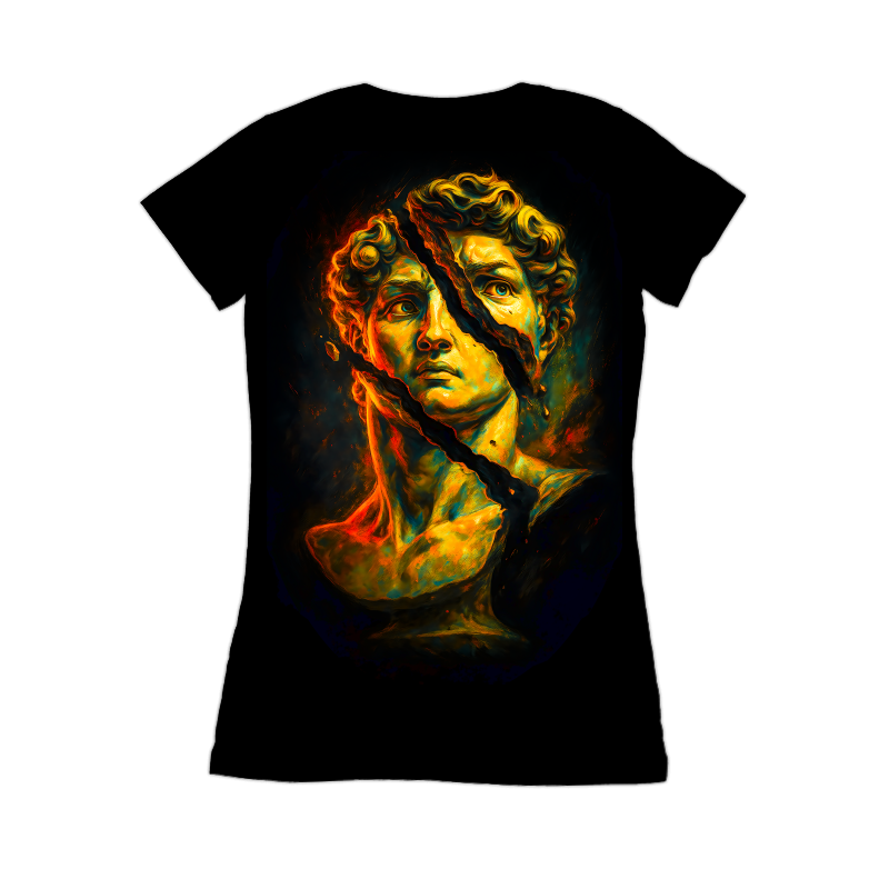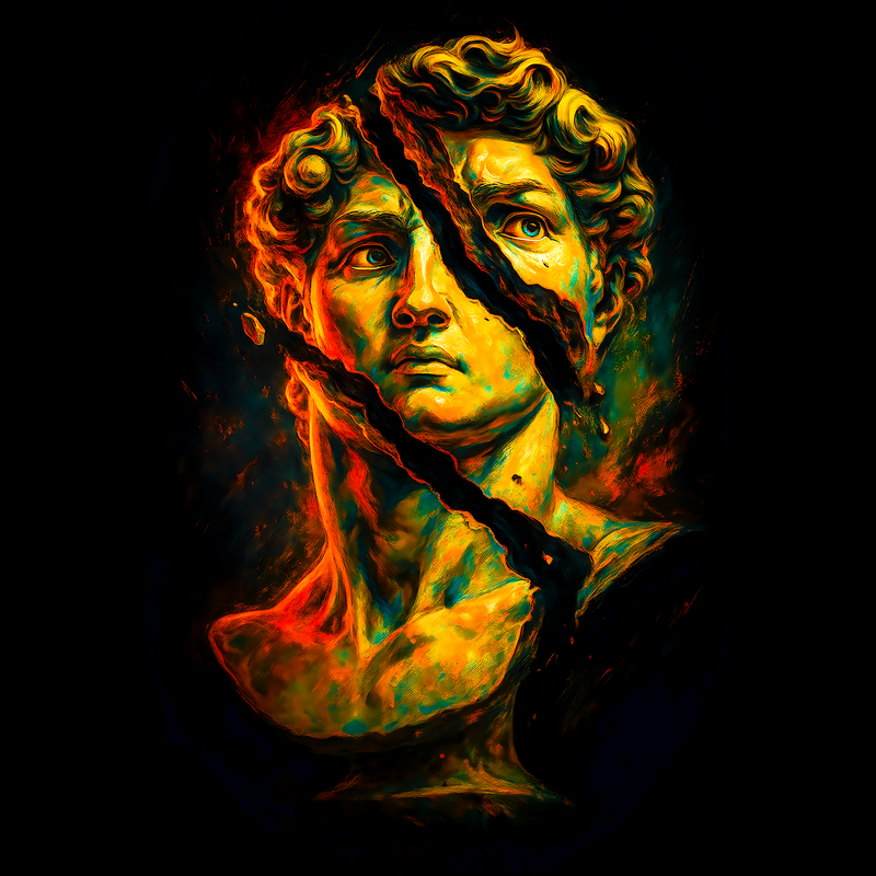 This striking design features a classical bust, reminiscent of ancient Greek or Roman sculpture, dramatically fractured by a bold, jagged line. The color palette is vibrant and modern, employing a mix of warm yellows, oranges, and reds contrasted with cooler greens and blues, giving the piece a contemporary edge. The texture appears painterly, with visible brushstrokes adding depth and dimension. The dark background emphasizes the luminosity of the bust, drawing the viewer's eye to the central figure and the dynamic break that bisects it. The overall effect is a compelling blend of the old and the new, suggesting themes of disruption, transformation, and the enduring power of classical art. This artwork would be well-suited for applications ranging from digital art prints to bold graphic designs. Designers could use this image to create impactful visuals for posters, album covers, or website backgrounds. Its blend of classic and modern styles makes it versatile for projects targeting a broad audience, from art enthusiasts to those seeking edgy, contemporary designs. The fractured element adds a layer of intrigue, ideal for conveying themes of change or innovation.