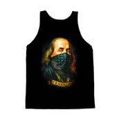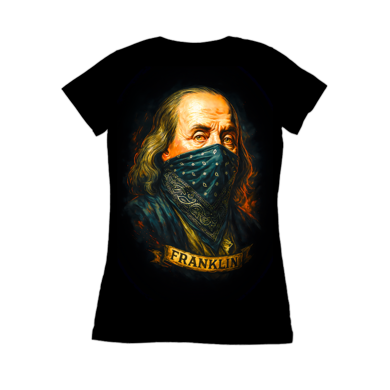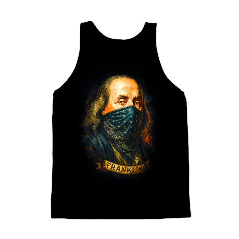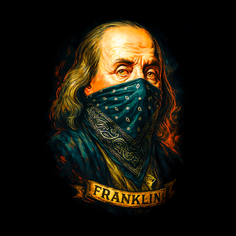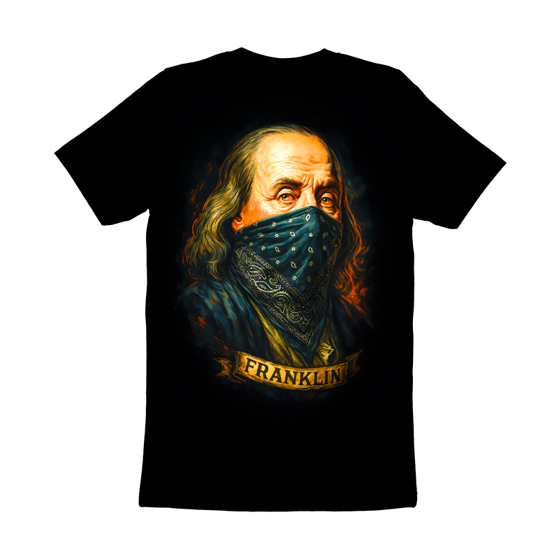 This design presents a stylized portrait of Benjamin Franklin, reimagined with a modern, edgy twist. The iconic figure is depicted wearing a blue paisley bandana that covers his face, lending an air of mystery and rebellion to the historical image. The artwork blends classical portraiture with contemporary urban aesthetics, creating a striking contrast between the formal attire and the streetwise accessory. The color palette is rich and vibrant, with deep blues and oranges creating a dynamic visual impact. The title "Franklin" is emblazoned on a golden banner below the portrait, reinforcing the subject's identity while adding a touch of vintage flair. This design cleverly subverts expectations, offering a fresh perspective on a familiar historical figure. Designers could use this image to create eye-catching apparel, posters, or digital art. It would appeal to those seeking a blend of history and modern street culture. The design's bold aesthetic makes it suitable for streetwear brands, edgy marketing campaigns, or even educational materials aiming to engage younger audiences. It could also be incorporated into designs for financial literacy campaigns, adding a touch of irreverence to serious topics.