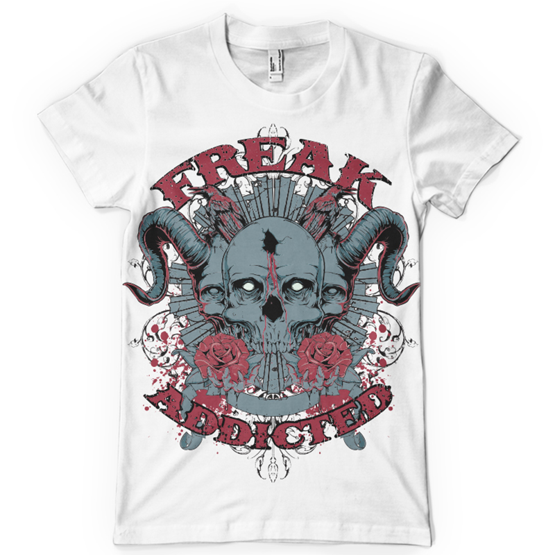 Freak addicted printed t-shirt features a detailed screen print of shooted skull is now available in EPS format file and can be used for digital printing and screenprinting . Ready to print or use in anything you want.