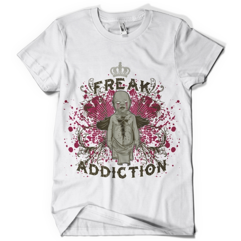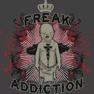 Digital t-shirt design featuring detailed zombie with tears of blood cutted on his chest. Freak Addiction is available in vector format for Adobe Illustrator, Adobe Photoshop and Corel Draw and can be used for digital printing and screenprinting .