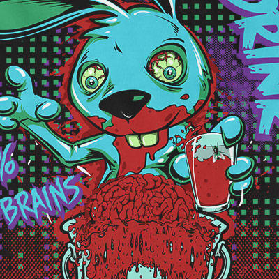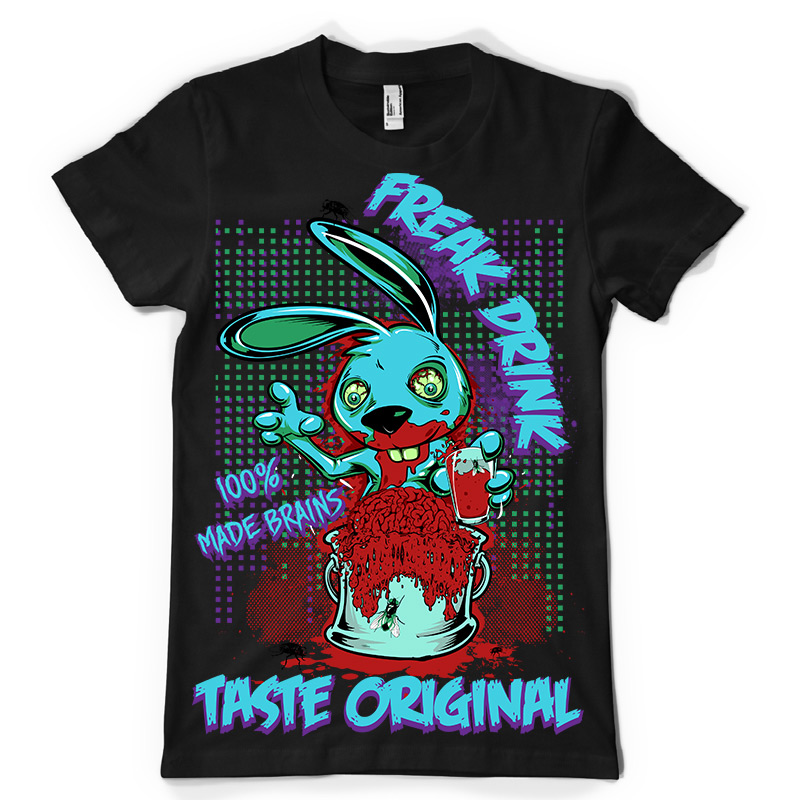 Freak Drink t-shirt design features a detailed screen print of creepy bunny drinking blood now available for Adobe Illustrator, Adobe Photoshop and Corel Draw and can be used for digital printing and screenprinting .