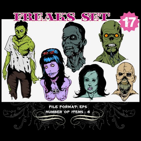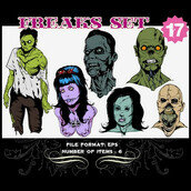 Freaks are here to feed your darkest design dreams and horror ideas. Our vector offer you a wide range of possibilities – monsters, creatures, zombies or deformed animals - all very useful when it comes to designing for rock bands, motorcycles clubs, CD covers and posters. It's a combination of many different styles and textures to bring you some awesome EPS vector files that will rock forever.