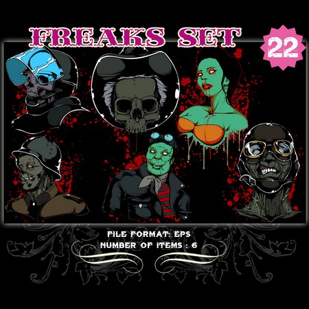 Freaks are here to feed your darkest design dreams and horror ideas. Our vector offer you a wide range of possibilities – monsters, creatures, zombies or deformed animals - all very useful when it comes to designing for rock bands, motorcycles clubs, CD covers and posters. It's a combination of many different styles and textures to bring you some awesome EPS vector files that will rock forever.