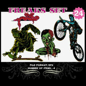 Freaks are here to feed your darkest design dreams and horror ideas. Our vector offer you a wide range of possibilities – monsters, creatures, zombies or deformed animals - all very useful when it comes to designing for rock bands, motorcycles clubs, CD covers and posters. It's a combination of many different styles and textures to bring you some awesome EPS vector files that will rock forever.