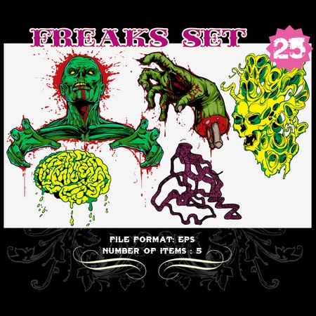 Freaks are here to feed your darkest design dreams and horror ideas. Our vector offer you a wide range of possibilities – monsters, creatures, zombies or deformed animals - all very useful when it comes to designing for rock bands, motorcycles clubs, CD covers and posters. It's a combination of many different styles and textures to bring you some awesome EPS vector files that will rock forever.